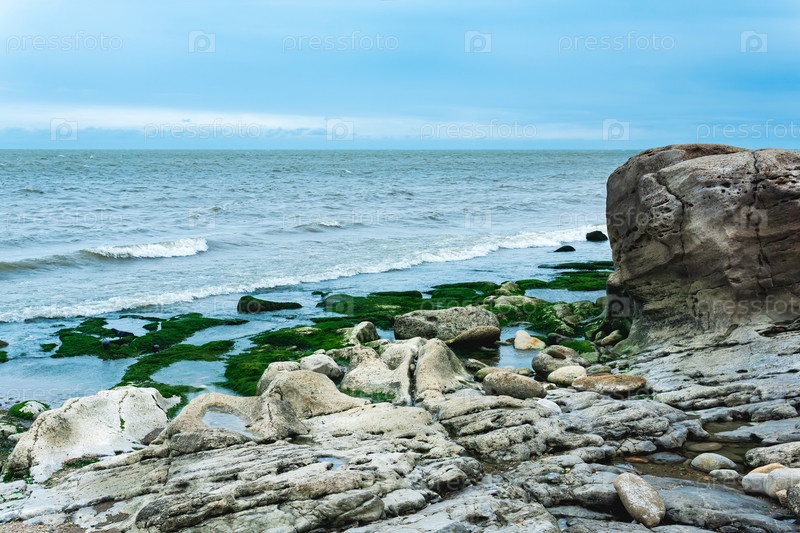 Побережье Каспийского моря с прибрежными скалами и камнями, покрытыми водорослями