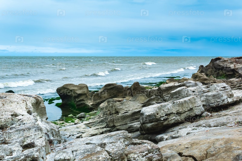 Морской пейзаж, берег Каспийского моря с покрытыми водорослями прибрежными камнями