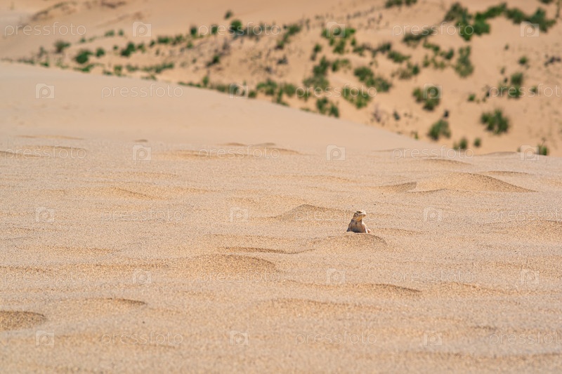 Пустынная ящерица-жабоголовая агама на вершине песчаной дюны Сарыкум на фоне зеленой равнины