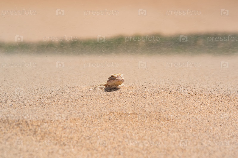 Жабоголовая ящерица-агама быстро зарылась в песок, вибрируя всем телом во время песчаной бури