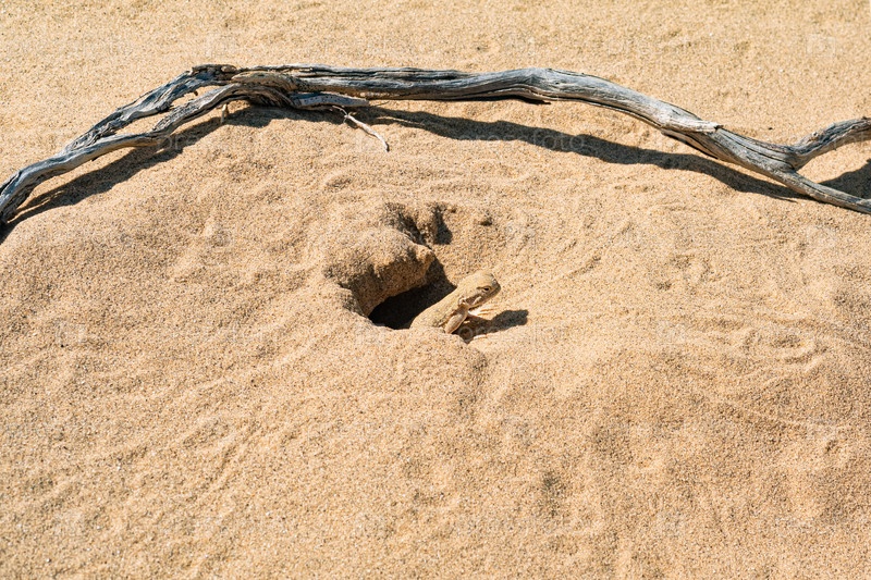 Жабоголовая ящерица-агама возле своей норы в песке пустыни