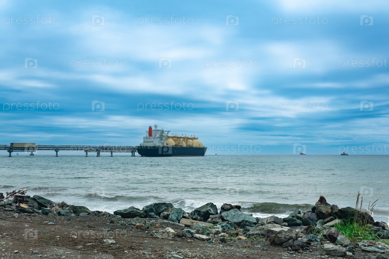 Танкер-перевозчик сжиженного природного газа во время погрузки на морском терминале СПГ