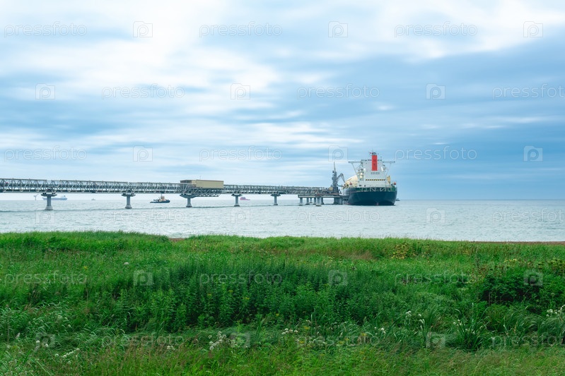 Танкер-перевозчик сжиженного природного газа во время погрузки на морском терминале СПГ