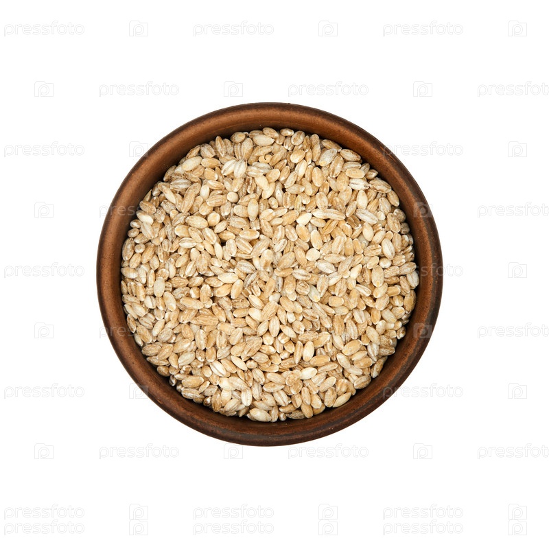 Перловая крупа в глиняной миске на белом фоне, вид сверху