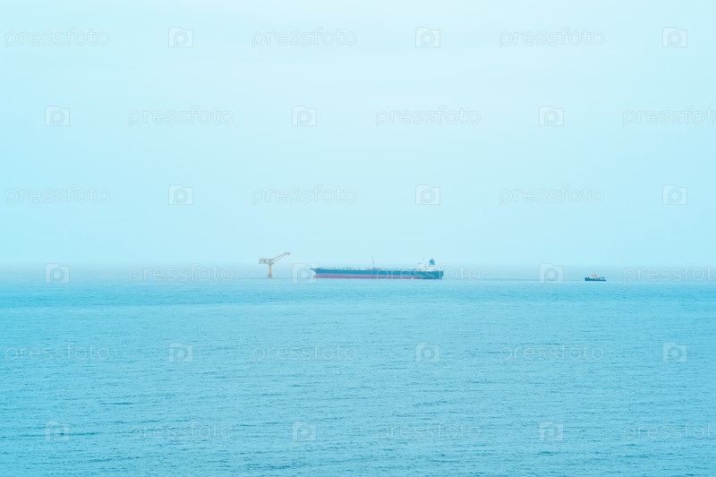Туманный морской пейзаж с танкером возле нефтяного терминала, расположенного далеко в море