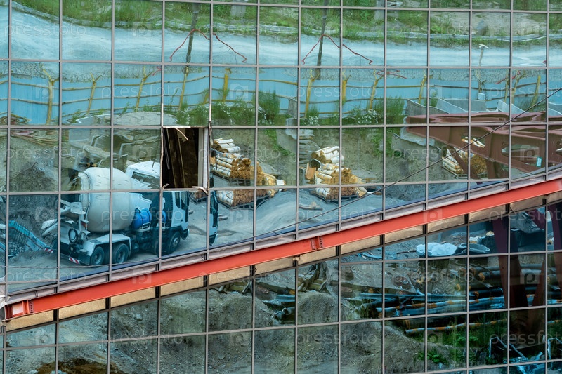 Промышленный фон - зеркальная стена недостроенного здания, отражающая строительную площадку