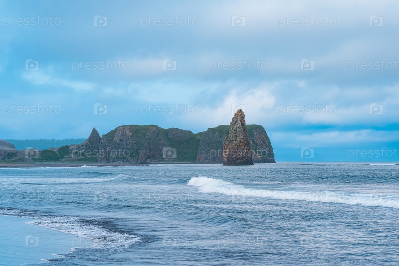 Морской пейзаж Кунашира, берег океана с огромной вертикальной скалой в воде
