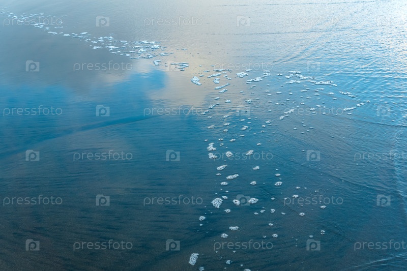 Океанский пляж с возвращающейся волной, в которой отражается небо