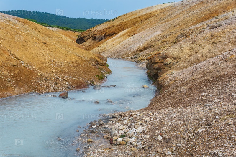 Горячий поток сероводорода среди берегов вулканического пепла и тефры в кальдере вулкана Головнина, остров Кунашир
