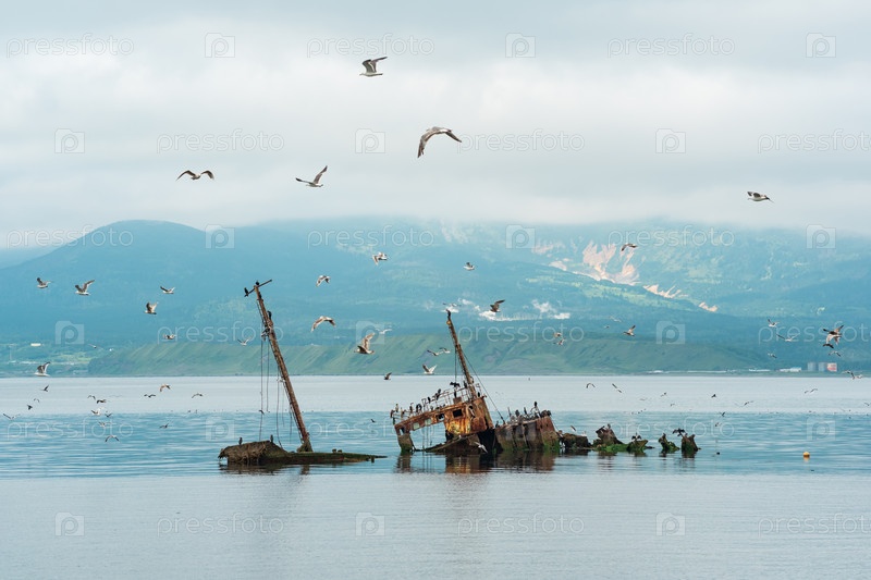 Кораблекрушение на фоне морского залива с туманными горами на заднем плане