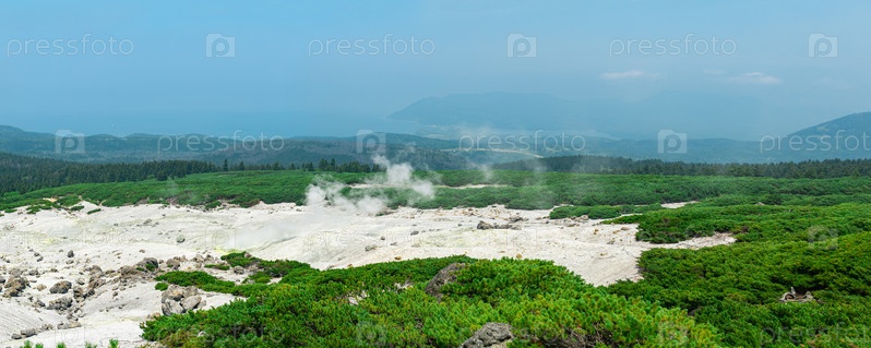 Фумарольное поле на склоне вулкана Менделеева на острове Кунашир с видом на океан