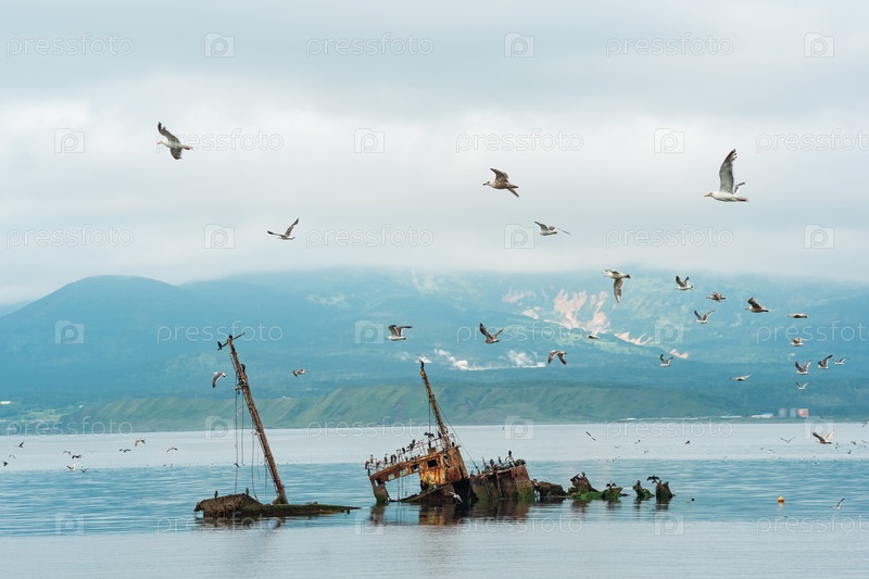 Затонувший корабль на фоне морского залива с туманными горами на заднем плане
