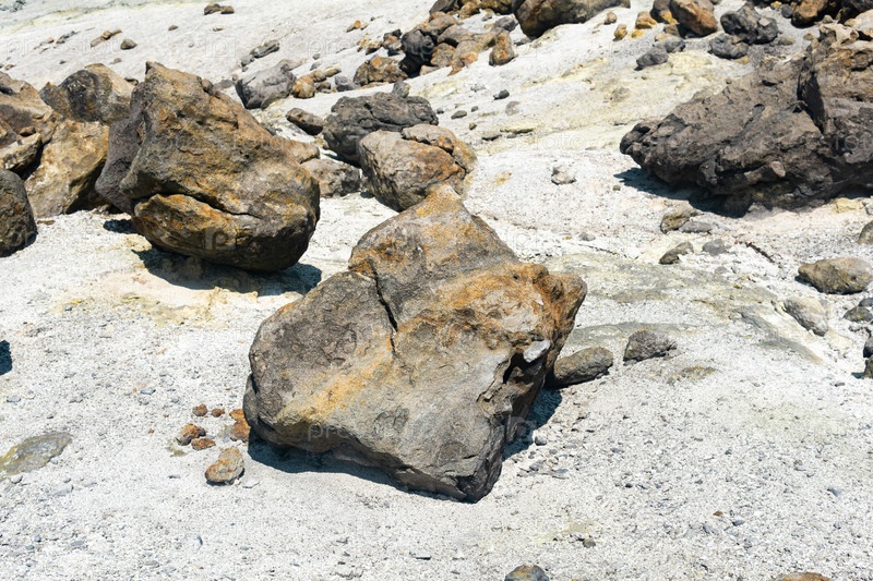 Вулканические бомбы среди тефры в фумарольном поле на склоне вулкана