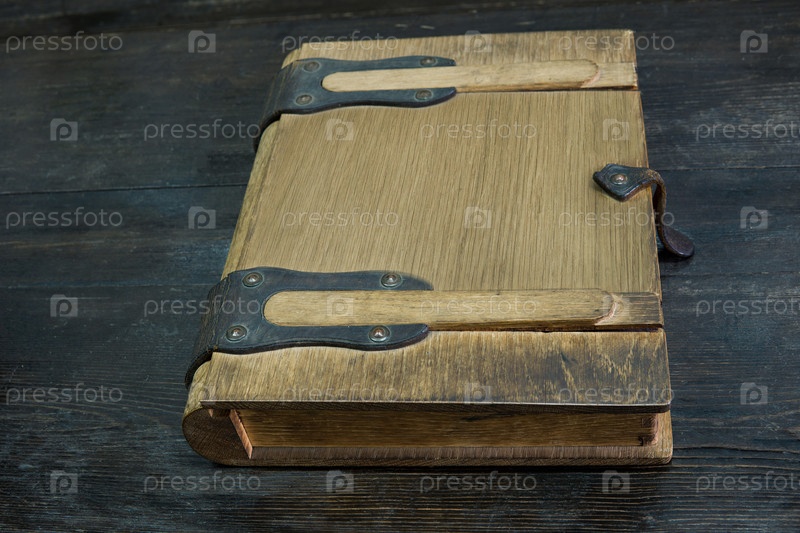 Старый журнал в деревянном футляре с застежками на черной столешнице, закрытый