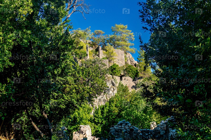 Стены древней крепости на скале среди леса в Олимпосе, Турция
