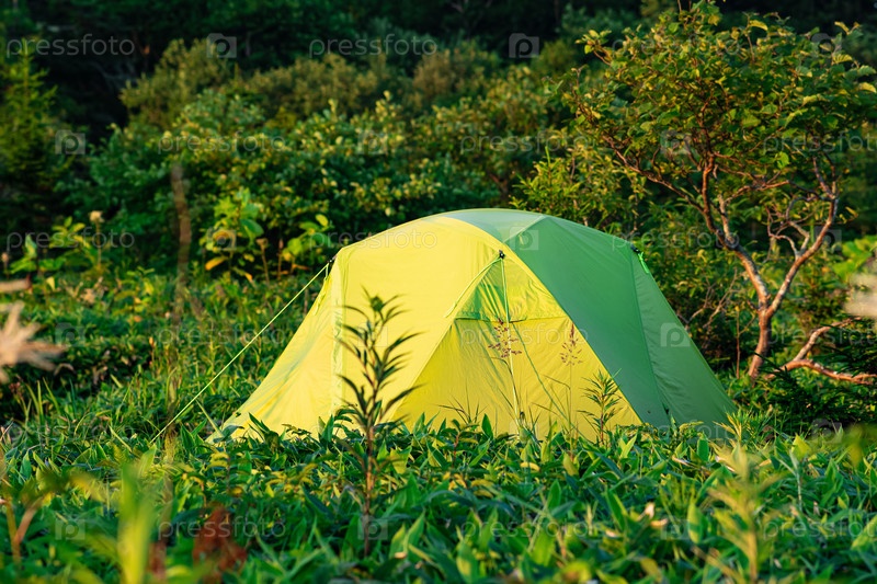 Туристическая палатка среди травы в лучах утреннего солнца