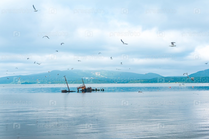 Затонувший корабль на фоне морского залива с туманными горами на заднем плане