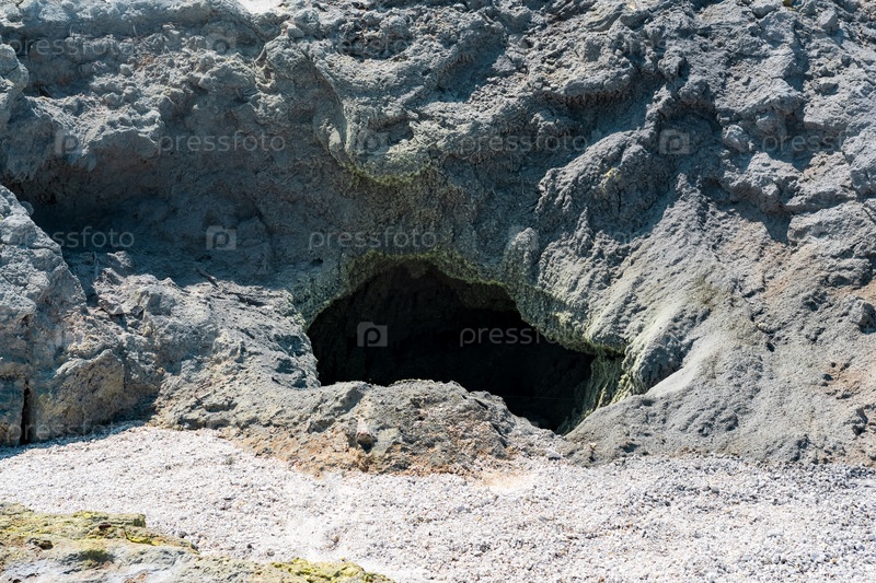 Выход вулканической фумаролы в землю, покрытый кристаллической серой