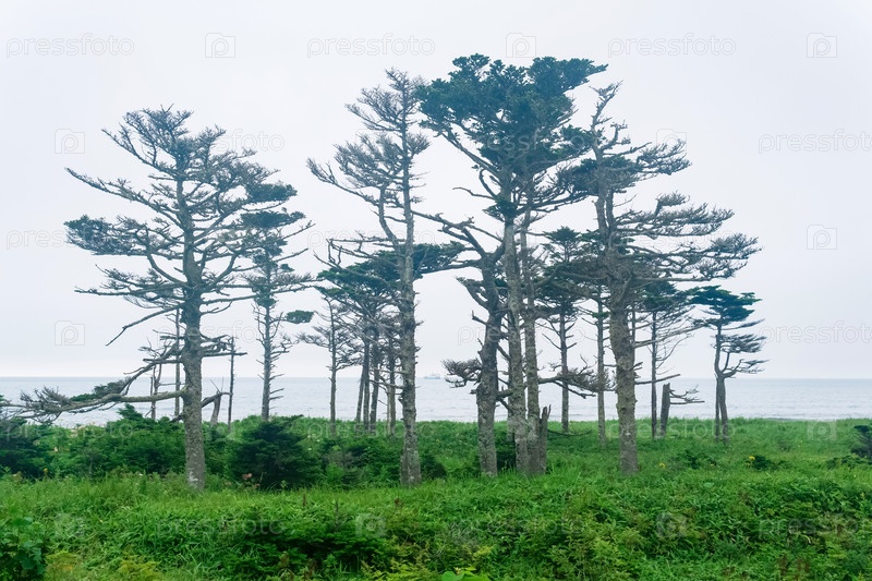 Прибрежный пейзаж острова Кунашир с изогнутыми ветром лесными массивами