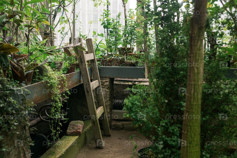 Интерьер большой теплицы с коллекцией тропических растений и оборудованием