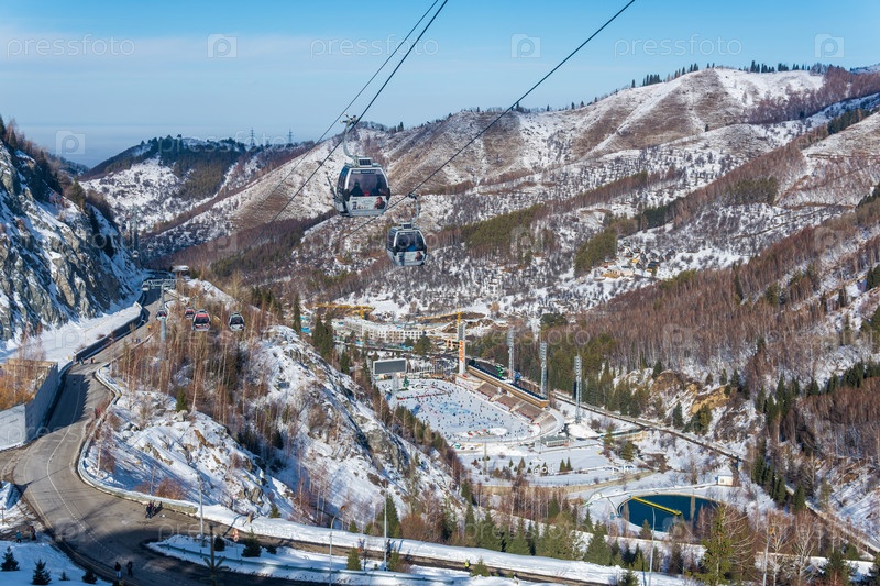 Канатная дорога для лыжников на фоне катка Медеу в Алматы, Казахстан