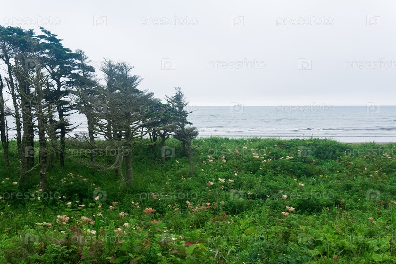 Прибрежный пейзаж острова Кунашир с изогнутыми ветром карликовыми соснами