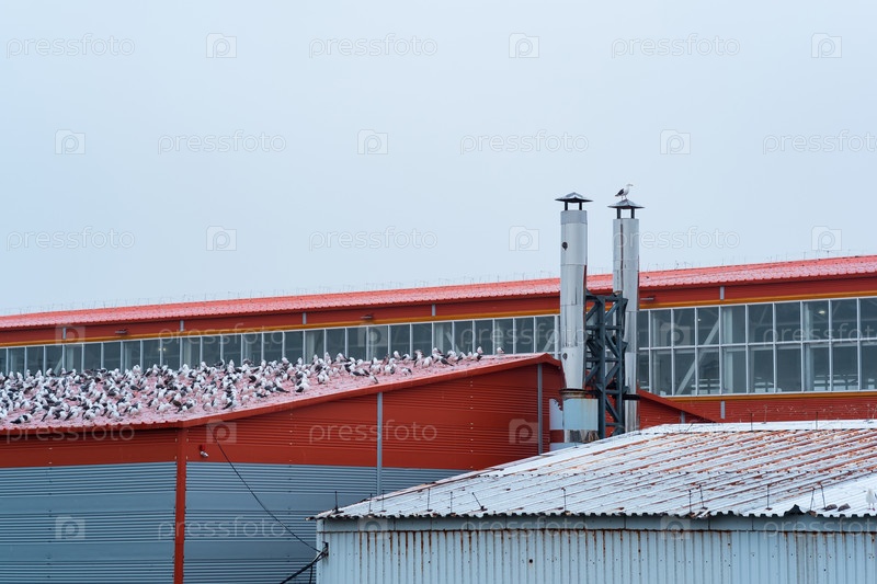 Промышленный пейзаж, множество чаек сидят на крыше рыбоперерабатывающего завода