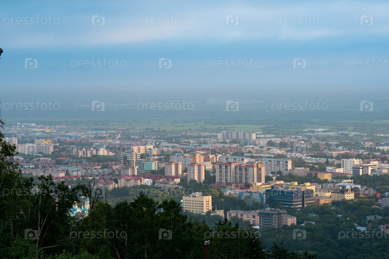 Воздушный городской пейзаж, вид на Южно-Сахалинск сверху с горы Большевик