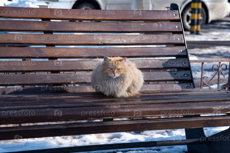 Рыжий пушистый бездомный кот на скамейке в парке зимой
