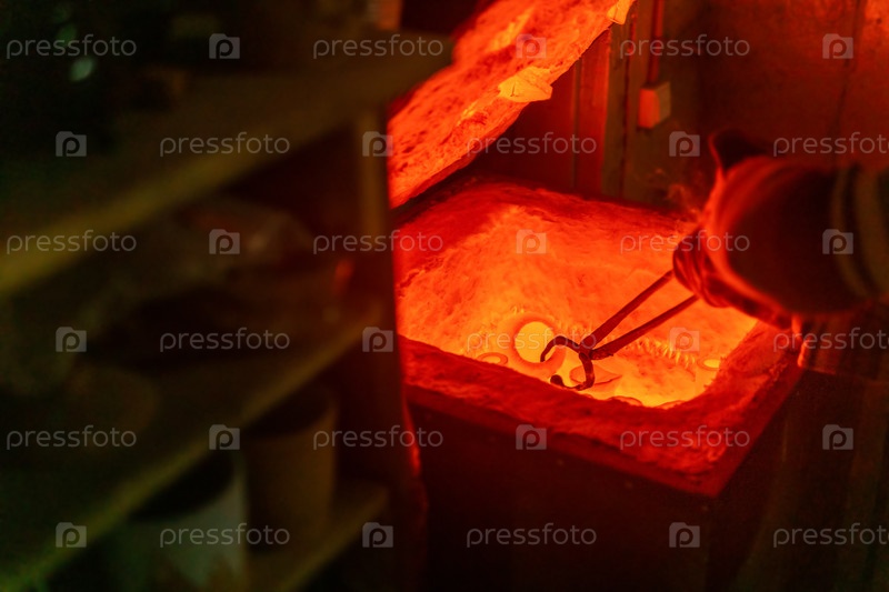 Гончар вынимает щипцами гончарное изделие из раскаленной электрической муфельной печи для обжига