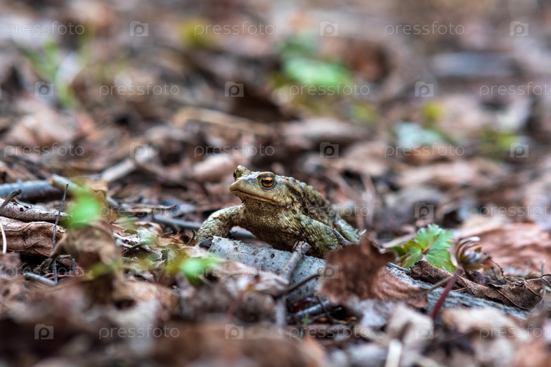 Обыкновенная жаба после спячки среди сухой листвы