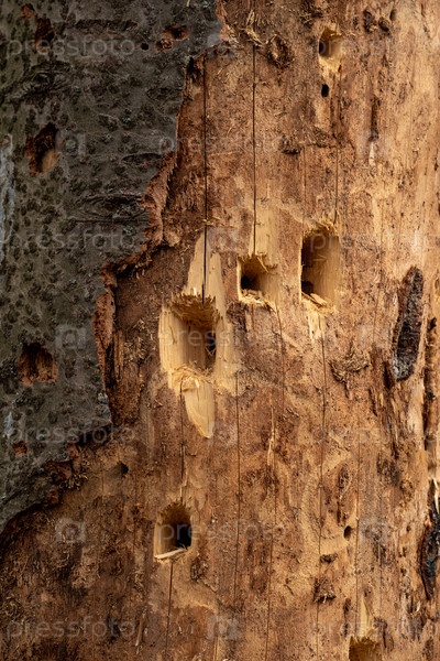 Дыры в стволе сухого дерева, пробуренные кормящимся дятлом