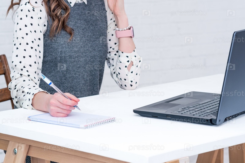 Женщина за столом в помещении работает с ноутбуком и бумажным блокнотом