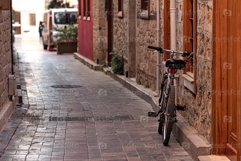 Велосипед припаркован в историческом узком переулке в Калеичи, историческом центре Антальи