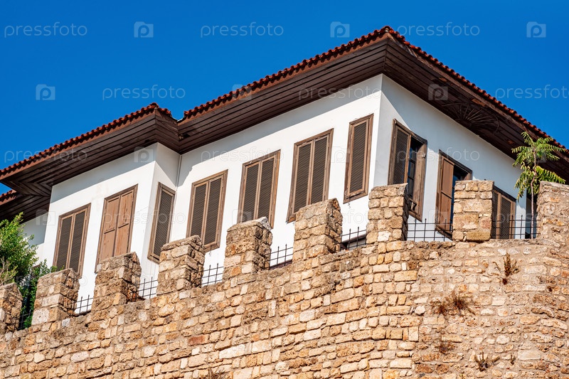 Традиционный дом с черепичной крышей и ставнями за древней крепостной стеной в Калеичи, историческом районе Антальи