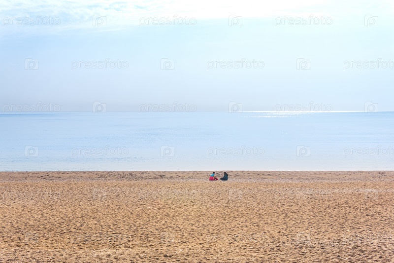 Пара сидит и болтает на пустынном пляже