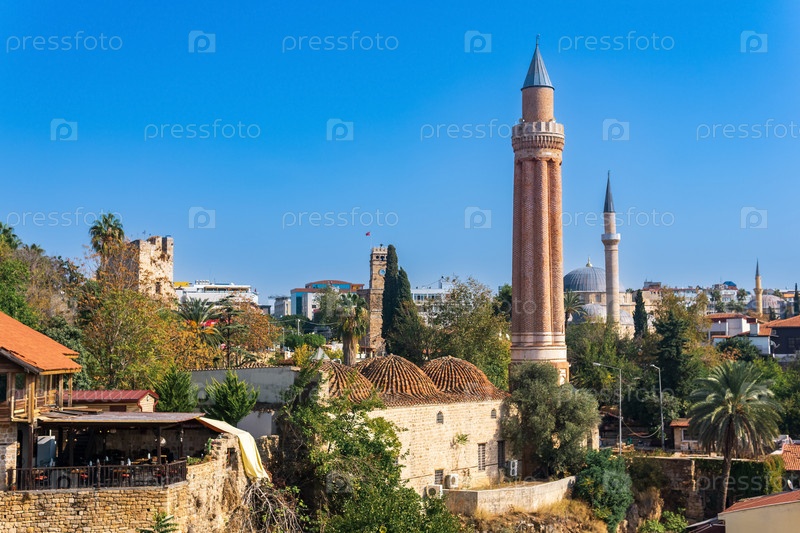 Вид на Калеичи, исторический центр Антальи, минарет Йивли и часовую башню Саат Кулеси
