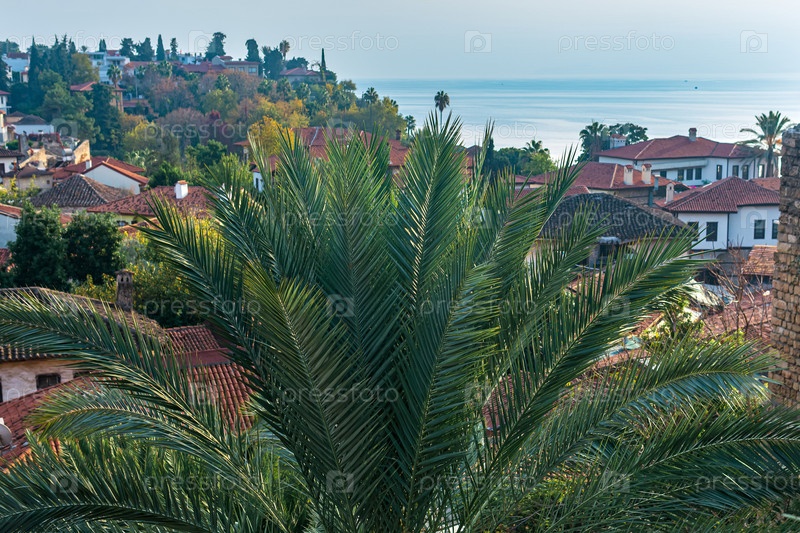 Пальма на фоне крыш древнего прибрежного средиземноморского города Калеичи, исторического центра Антальи, Турция