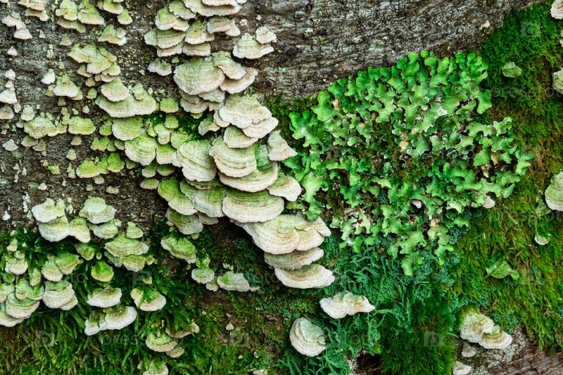 Древесные грибы, мох и лишайники на коре дерева, фон, текстура