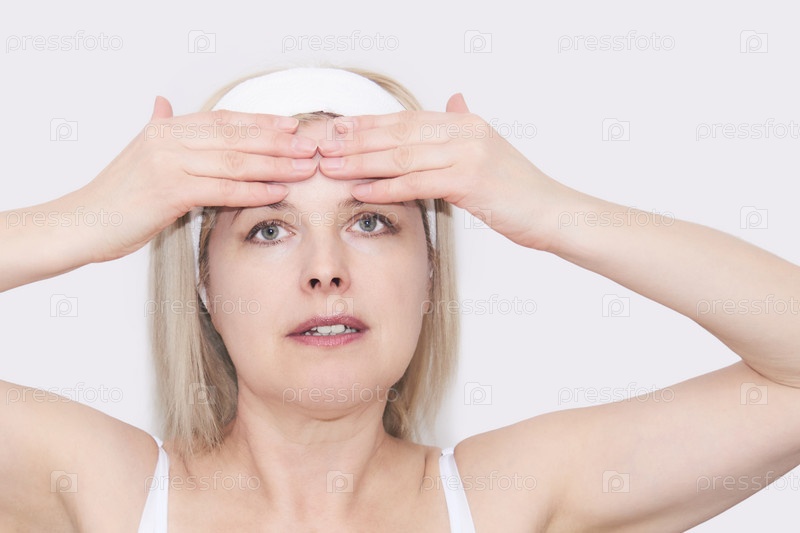 Женщина средних лет делает самомассаж лица в области лба, портрет крупным планом