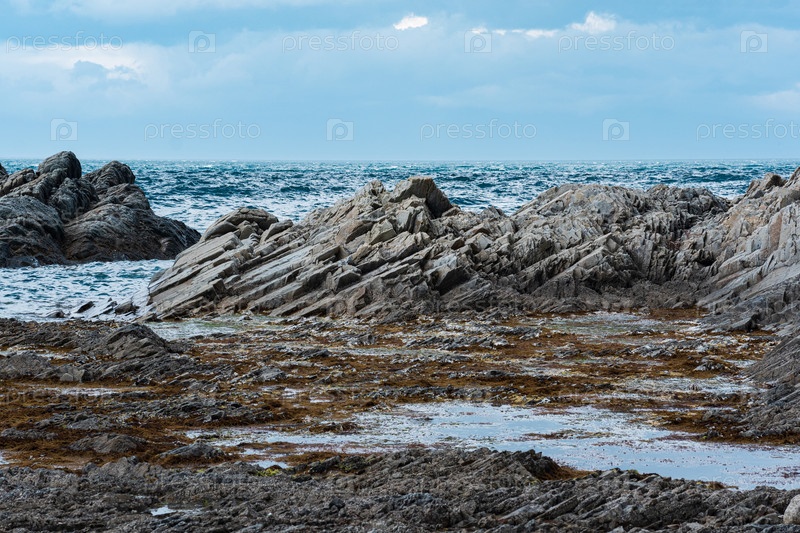 Прибрежный морской пейзаж с красивыми столбчатыми базальтовыми скалами во время отлива