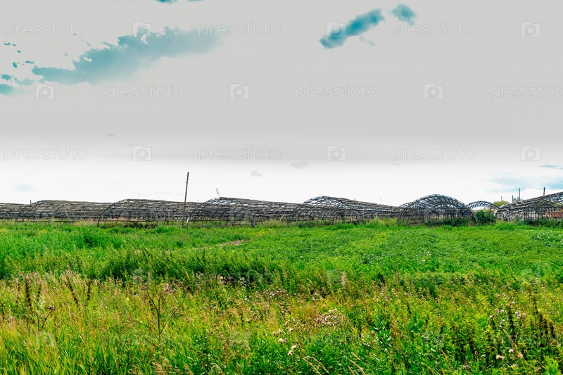 Каркасы заброшенных теплиц среди дикой травы, кризис сельскохозяйственного производства