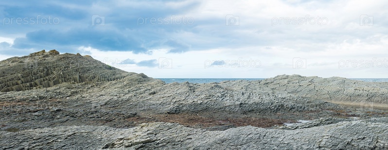 Скалистый морской берег из столбчатого гранита, застывшей лавы, напоминающей чешую или булыжную мостовую, побережье острова Кунашир