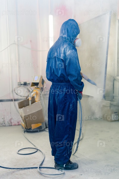 Рабочий покрывает стальные детали порошковой краской в покрасочной камере