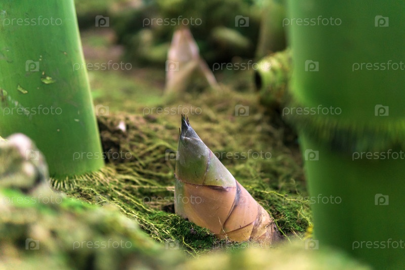Росток бамбука, растущий на земле среди больших стеблей бамбука