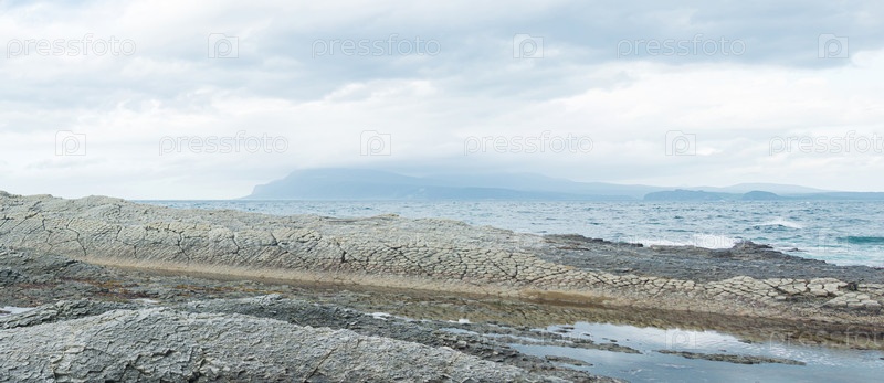 Скалистый морской берег из столбчатого гранита, застывшей лавы, напоминающей чешую или булыжную мостовую, побережье острова Кунашир