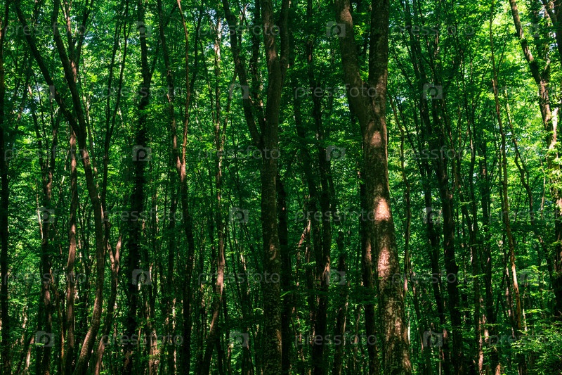 Кроны и стволы высоких деревьев в густом широколиственном лесу