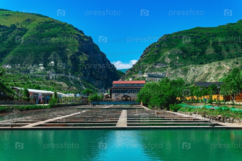Общий вид экотуристического комплекса "Главрыба" с рыбной фермой в Миатли, Дагестан