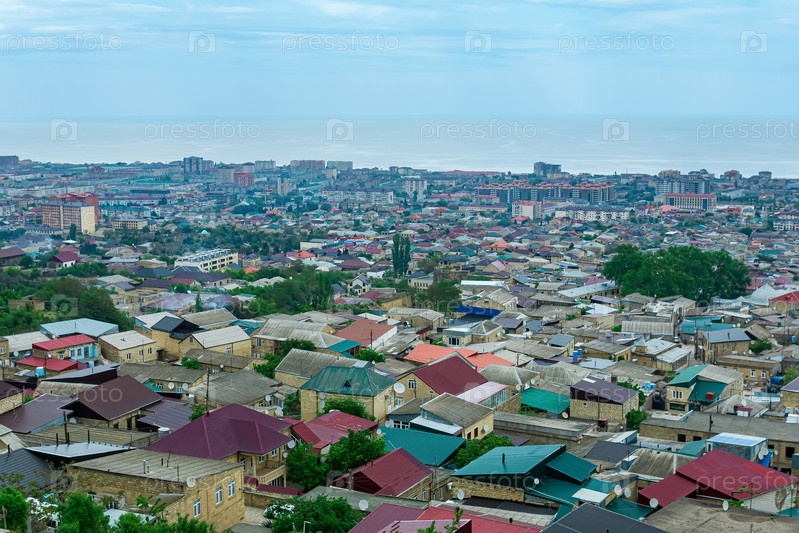 Вид сверху со стены цитадели на исторический центр города Дербент и Каспийское море