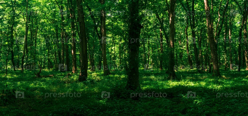 Лесной пейзаж, тенистая летняя грабовая роща с пышной листвой в солнечный день